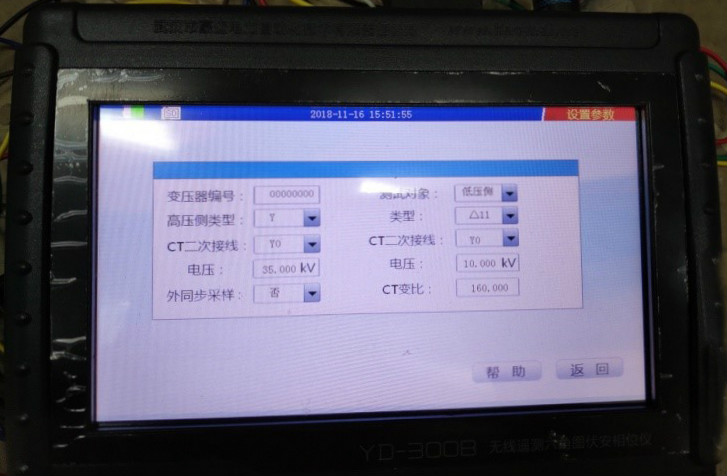 2、YD300B 相位儀在保護柜進行測量,六角圖測試專用線的黃綠紅黑分別接變壓器高壓側CT二次的ABC和公共端,藍白棕黑分別接低壓側CT二次的ABC和公共端。