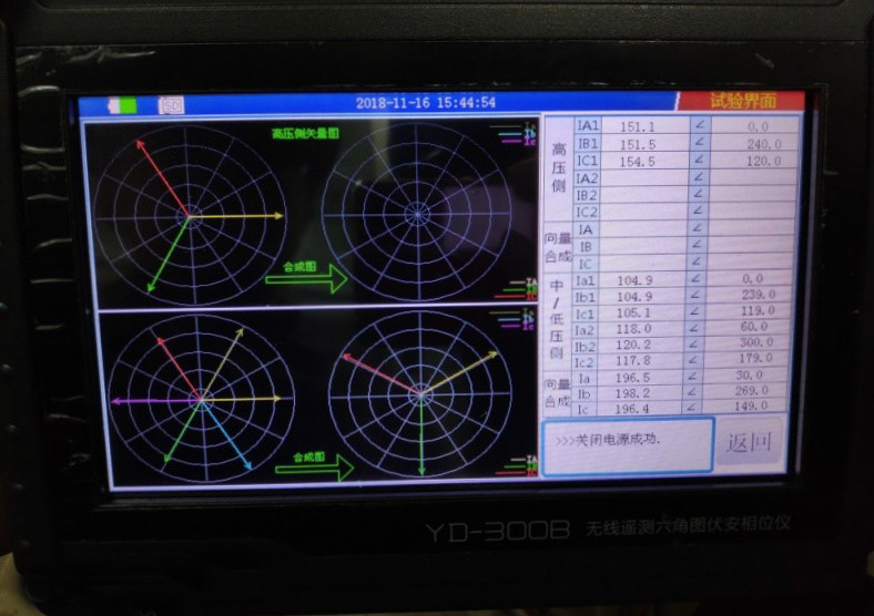 智能變電站測試:需要兩臺YD300B 相位儀和一臺YD-200-W 室外機,測量高壓側CT二次電流的YD300B 相位儀作為主控機,測量低壓側CT二次電流的YD300B 相位儀接好線后,只需要點擊進入“投運前測六角圖”界面,由測量高壓側CT二次電流的YD300B 相位儀開始測試。測量高壓側CT二次電流的YD300B 相位儀六角圖測試專用線黃綠紅黑分別對應高壓側CT二次電流ABC和公共端。測量低壓側CT二次電流的YD300B 相位儀六角圖測試專用線藍白棕黑分別接對應低壓側CT二次電流ABC和公共端。