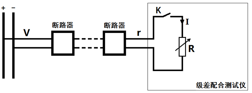 2) 設(shè)定某一測試電流Iset,裝置根據(jù)(R+r)=U/Iset計(jì)算得出所需的Rset值,調(diào)節(jié)R為Rset,閉合K,回路即可產(chǎn)生接近Iset的電流,觀察各級空開是否能正確配合跳閘。