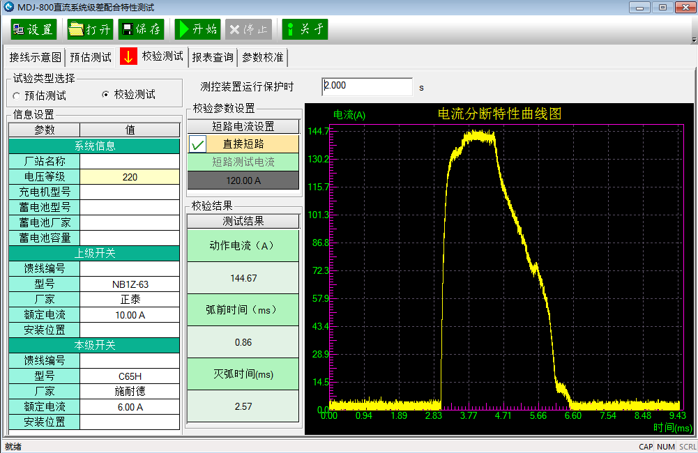 4 )校驗(yàn)測試即短路測試,直接在當(dāng)前直流斷路器末級進(jìn)行短路測試,快速采集短路電流繪制成曲線, 計(jì)算出斷路器動作電流、弧前時間、滅弧時間,并人工觀察確定級差配合實(shí)際跳閘情況。