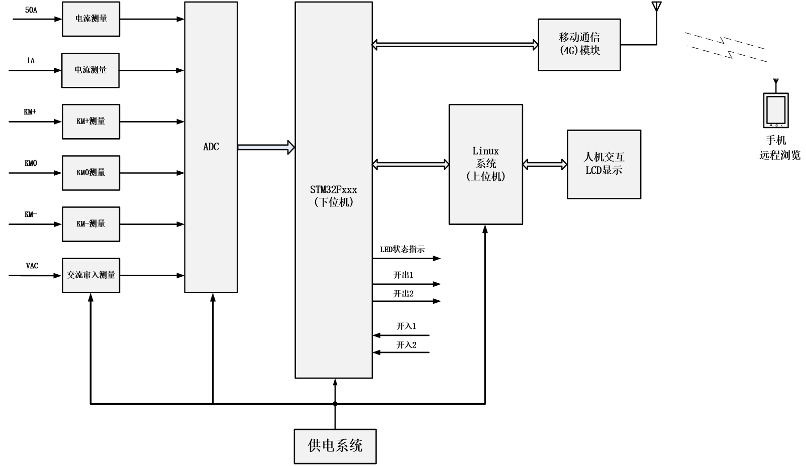 變電站直流應(yīng)急監(jiān)控儀主要由兩大部分組成,直流應(yīng)急監(jiān)測模塊和通信模塊。 直流應(yīng)急監(jiān)測模塊包含下位機(jī)和ADC部分,完成直流系統(tǒng)信息采集、過壓欠壓告警發(fā)出、接地告警發(fā)出。 通信模塊由Linux上位機(jī)和移動通信部分組成,完成直流系統(tǒng)信息現(xiàn)場顯示及遠(yuǎn)程發(fā)送。
