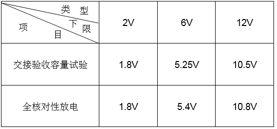 單體電壓下限 : 蓄電池單體的電壓保護(hù)下限。 放電過程中如發(fā)現(xiàn)單體電壓跌落到該設(shè)置值以下時(shí),試驗(yàn)自動(dòng)停止,避免單體電池過放。 根據(jù)DLT724-2000標(biāo)準(zhǔn),交接驗(yàn)收時(shí)和核對性放電時(shí),二者的設(shè)置略有差別。 以閥控蓄電池為例,其差別如下表所示: