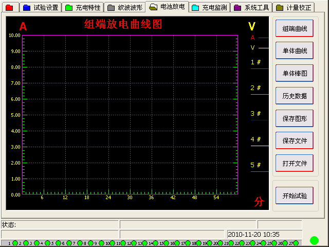 組端曲線 : 顯示蓄電池組組端電壓、放電電流隨時(shí)間的變化曲線。 組端電流曲線顏色和坐標(biāo)系左側(cè)字母A顏色相同,組端電壓曲線顏色和坐標(biāo)系右側(cè)字母V顏色相同。 X軸表示時(shí)間,左側(cè)y坐標(biāo)表示放電電流,右側(cè)y坐標(biāo)表示蓄電池組端電壓。