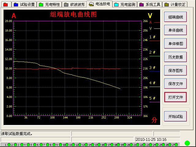 打開文件 : 再現(xiàn)歷史放電數(shù)據(jù),并可查看組端電壓曲線、單體放電曲線、單體棒圖等。