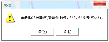 聽到繼電器“哐”的響聲后立即合上測試儀和負(fù)載箱斷路器開關(guān)進(jìn)入試驗(yàn)狀態(tài)(此試驗(yàn)負(fù)載箱斷路器合上30A檔位,與測試儀主機(jī)自動(dòng)合成60A),否則彈出“警告”窗口,用戶需先合上斷路器再點(diǎn)“是”(Y)進(jìn)入試驗(yàn)狀態(tài)。 加上負(fù)載箱時(shí)面板會(huì)提示電流超過設(shè)置的最大電流,此處直接點(diǎn)“是”(Y)按鈕。