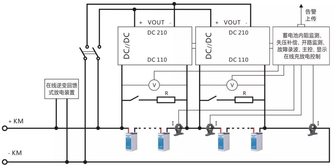 2、直流母線失壓補償,蓄電池組某節(jié)/某段失效或開路時,通過失壓補償裝置將良好段電池組能量饋送至直流母線,保障直流母線穩(wěn)定可靠運行