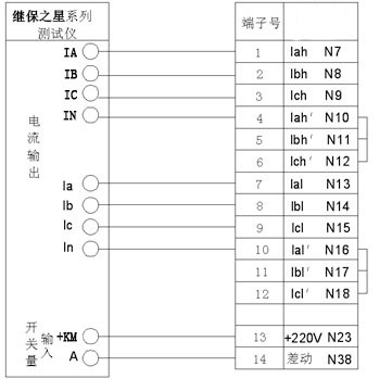 高壓側(cè)電流由繼保之星-7000A 的IA、IB、IC、IN接到保護(hù)裝置高壓側(cè)CT繞組,低壓側(cè)電流由測(cè)試儀Ia、Ib、Ic、In接到保護(hù)裝置低壓側(cè)繞組,將開入量A接到保護(hù)裝置跳閘出口。