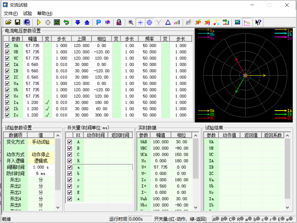 選擇交流試驗(yàn)?zāi)K,將六路電壓都設(shè)置為零,高壓側(cè)三相電流設(shè)置為0.56A,相序?yàn)檎颍介L(zhǎng)為零。 為保證初始狀態(tài)差動(dòng)保護(hù)可靠不動(dòng)作,低壓側(cè)三相電流設(shè)置為1.20A(此時(shí)Id<Ie,Ir>2Ie,在制動(dòng)區(qū)),相序?yàn)檎颍介L(zhǎng)為0.01A,變化方式為手動(dòng)試驗(yàn)。