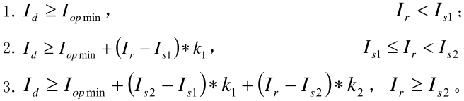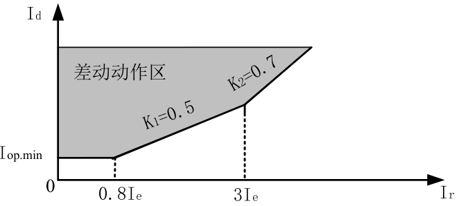 Id-差動(dòng)電流,Ir-制動(dòng)電流,Iop.min-最小動(dòng)作電流(定值單為0.4Ie),Is1-制動(dòng)電流拐點(diǎn)(0.8Ie),Is2-制動(dòng)電流拐點(diǎn)2(取3Ie); K1=0.5,K2=0.7,Ie-基準(zhǔn)側(cè)額定電流。