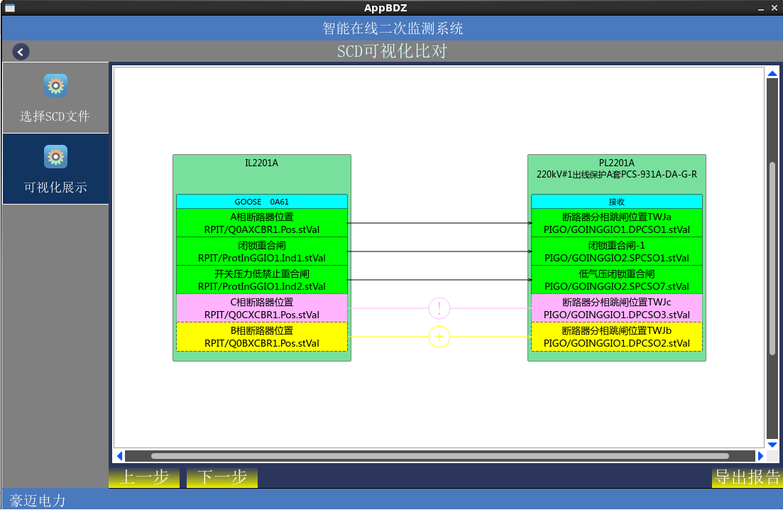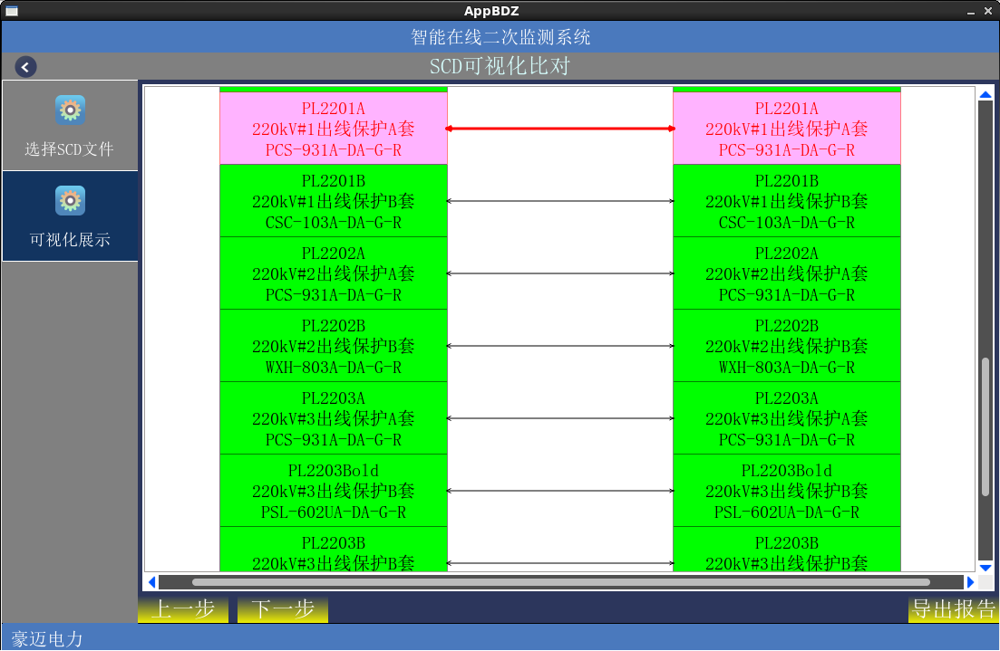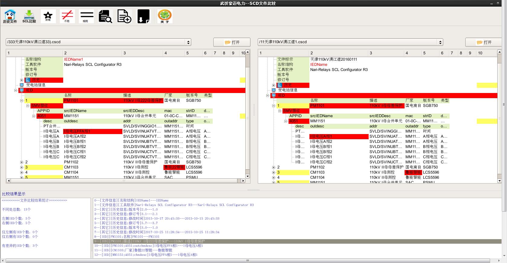 分為三級(jí)進(jìn)行可視化展示,第一級(jí)是IED層級(jí),紅色代表兩個(gè)SCD文件內(nèi)部存在差異。