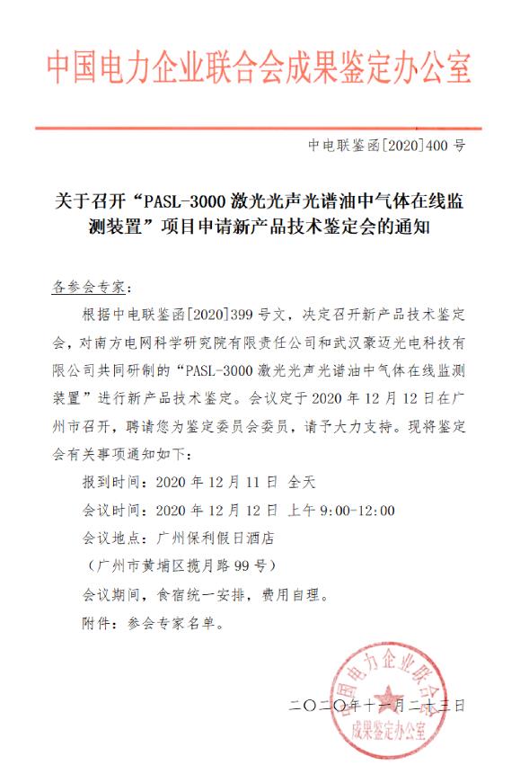 ?2020年12月12日,由中國(guó)電力企業(yè)聯(lián)合會(huì)成果鑒定辦公室組織,南方電網(wǎng)科學(xué)研究院有限責(zé)任公司和武漢豪邁光電科技有限公司共同研制的PASL-3000 激光光聲光譜油中氣體在線監(jiān)測(cè)裝置新產(chǎn)品技術(shù)鑒定會(huì)在廣州成功召開。