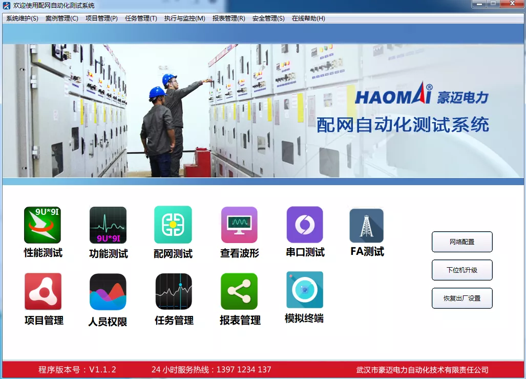 軟件主界面包含性能測試、功能測試、配網(wǎng)測試、查看波形、串口測試等功能界面。