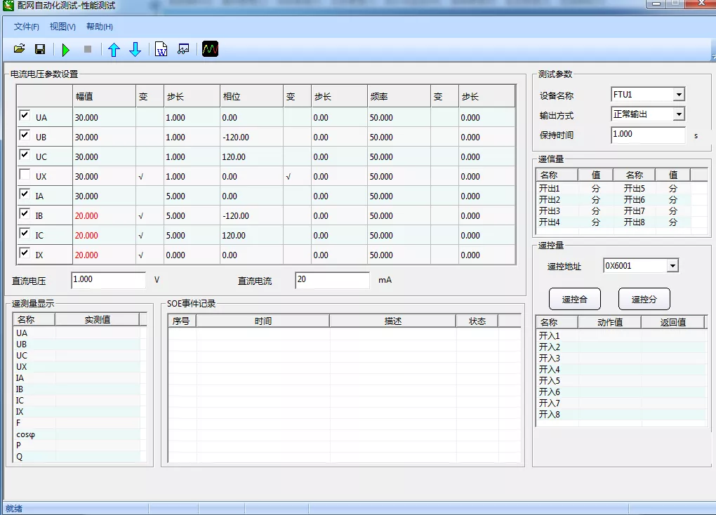 對配電終端輸入遙測量、遙信量并進行遙控操作,通過通信記錄配電終端事件順序,遙控操作記錄進行讀取,實現(xiàn)對配電終端歷史數(shù)據(jù)存儲功能檢測。