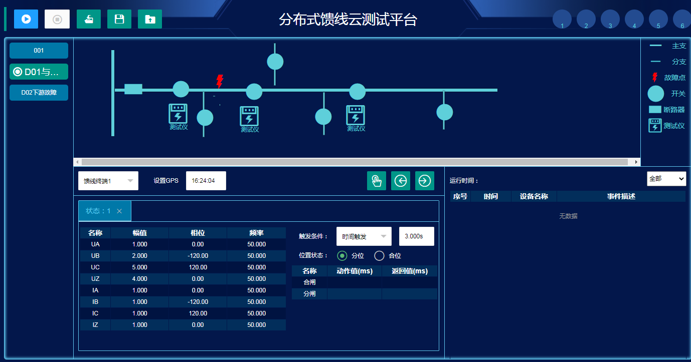 通過(guò)分布式饋線云測(cè)試平臺(tái)對(duì)景電線網(wǎng)絡(luò)進(jìn)行簡(jiǎn)易建模,自動(dòng)生成待測(cè)配電網(wǎng)絡(luò)的故障模擬測(cè)試方案。 根據(jù)待測(cè)配電網(wǎng)絡(luò)拓?fù)洹⒊跏歼\(yùn)行狀態(tài)、故障位置和類型,結(jié)合配電網(wǎng)故障特性,自動(dòng)生成每個(gè)測(cè)試用例在各個(gè)開(kāi)關(guān)監(jiān)測(cè)點(diǎn)的狀態(tài)序列,并將狀態(tài)序列傳遞到不同故障點(diǎn)的配電之星-P2200 配電自動(dòng)化終端測(cè)試儀。 測(cè)試時(shí)通過(guò)GPS北斗約定同步時(shí)間測(cè)試,各點(diǎn)配電之星-P2200根據(jù)當(dāng)前測(cè)試用例的狀態(tài)序列設(shè)置電流、電壓以及各個(gè)狀態(tài)量數(shù)據(jù),實(shí)現(xiàn)對(duì)一次網(wǎng)絡(luò)的在線模擬。 待測(cè)FA系統(tǒng)通過(guò)終端端子可以監(jiān)測(cè)到模擬量與狀態(tài)量數(shù)據(jù)變化,并做出FA決策,下發(fā)遙控命令控制開(kāi)關(guān)分合,WDS-3 配電開(kāi)關(guān)模擬試驗(yàn)盒收到遙控命令后,根據(jù)開(kāi)關(guān)響應(yīng)策略對(duì)遙控命令做出響應(yīng),從而實(shí)現(xiàn)對(duì)被測(cè)FA系統(tǒng)的測(cè)試。