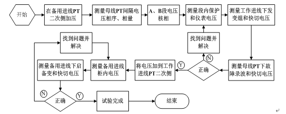 母線PT間隔電壓正常,之后檢查工作電源進線間隔,合上電壓空開,在保護裝置或測量儀表檢查二次電壓相序、相量是否正確。 待工作電源進線間隔檢查完畢,電壓準(zhǔn)確無誤后,斷開此間隔電壓空開。 合上下一間隔電壓空開,檢查方法同上。 檢查完畢并確保準(zhǔn)確無誤后斷開此間隔電壓空開,每做完一個間隔就切斷一個裝置的負(fù)荷,防止試驗過程中儀器過負(fù)荷而關(guān)機。 A段檢查完緊接著檢查B段,直至檢查完整段盤柜。