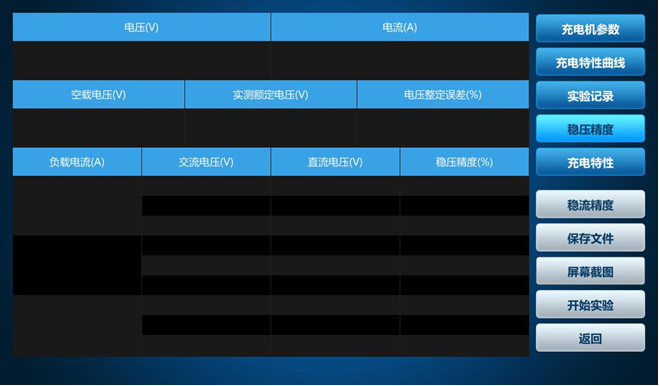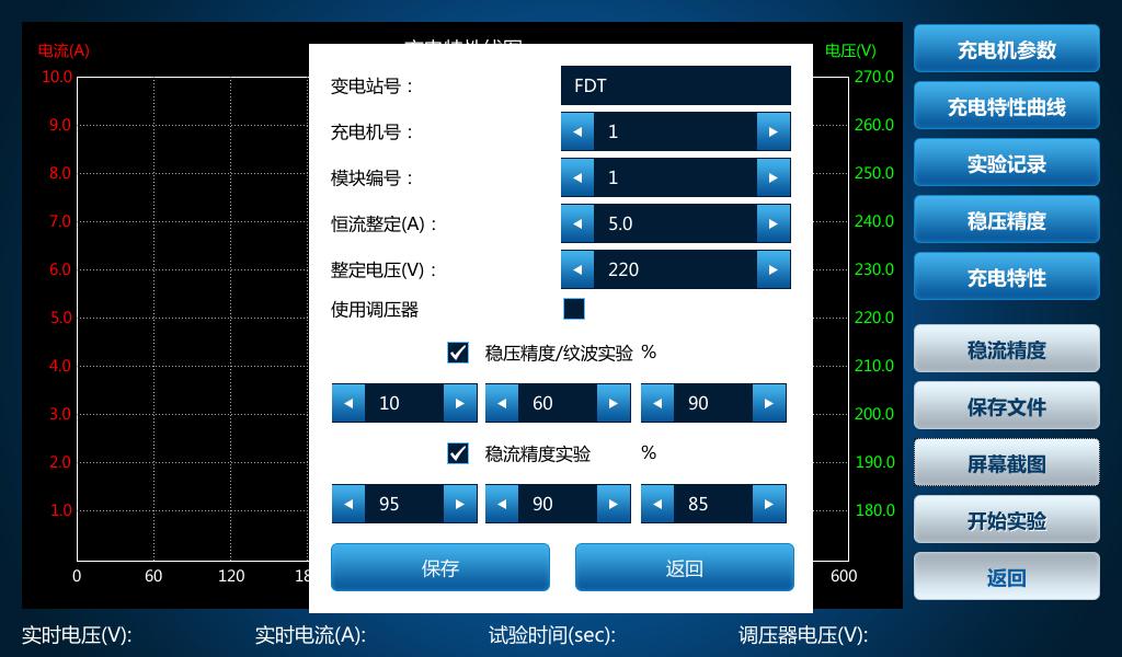 3)充電機(jī)特性試驗(yàn): 設(shè)置充電參數(shù)時若要使用調(diào)壓器則勾選,選擇對應(yīng)的穩(wěn)壓精度、充電特性、穩(wěn)流精度進(jìn)行試驗(yàn)。