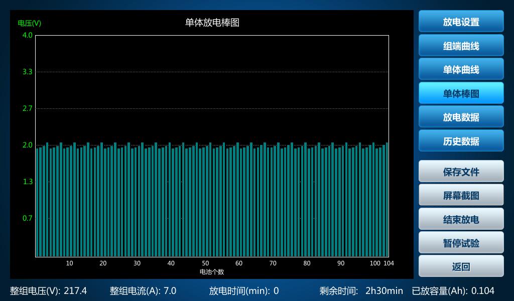 根據(jù)上述操作進(jìn)行試驗(yàn),試驗(yàn)結(jié)束后空開會自動關(guān)閉,若在放電試驗(yàn)中途空開斷開,可能是因?yàn)殡姵貑误w電壓或組端電壓達(dá)到了設(shè)置電壓的下限,同時屏幕上會彈出跳空開原因。 如果單體下限中斷試驗(yàn),會顯示電壓過低單體電池,方便快速找出容量小的電池。