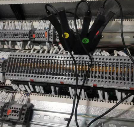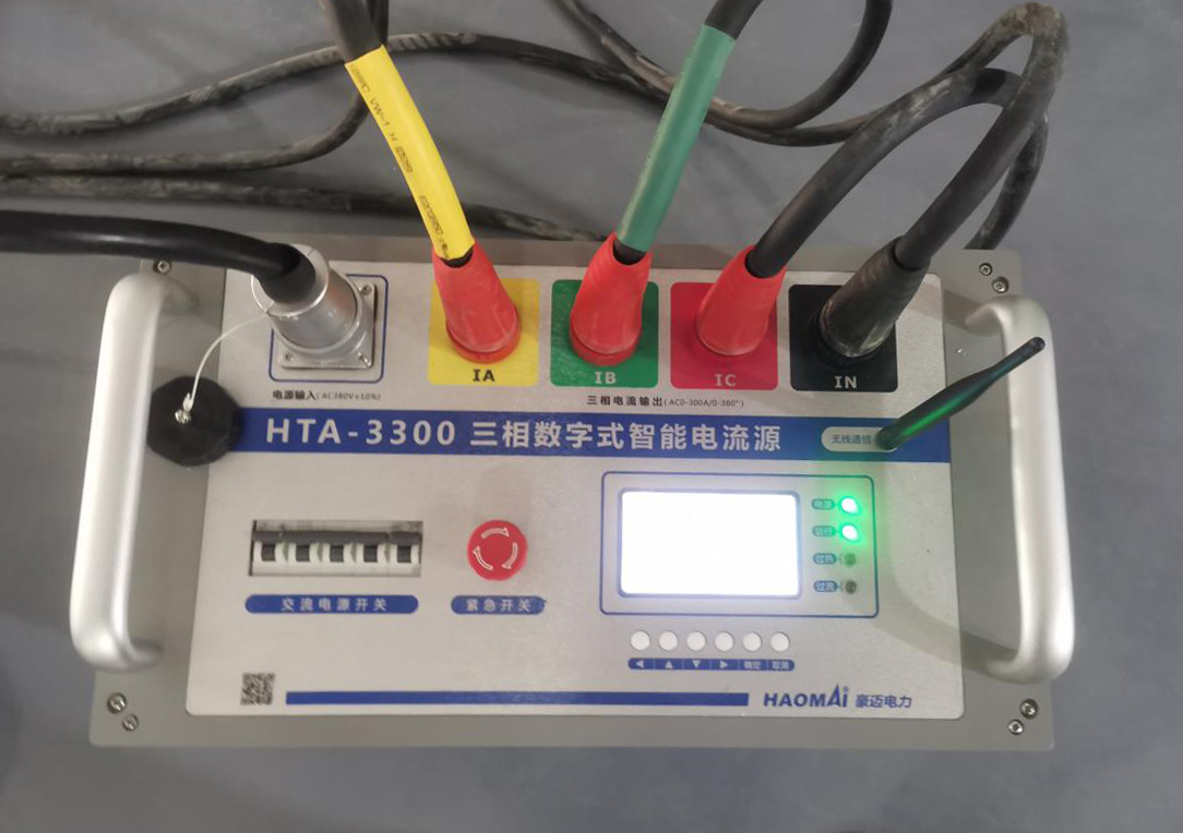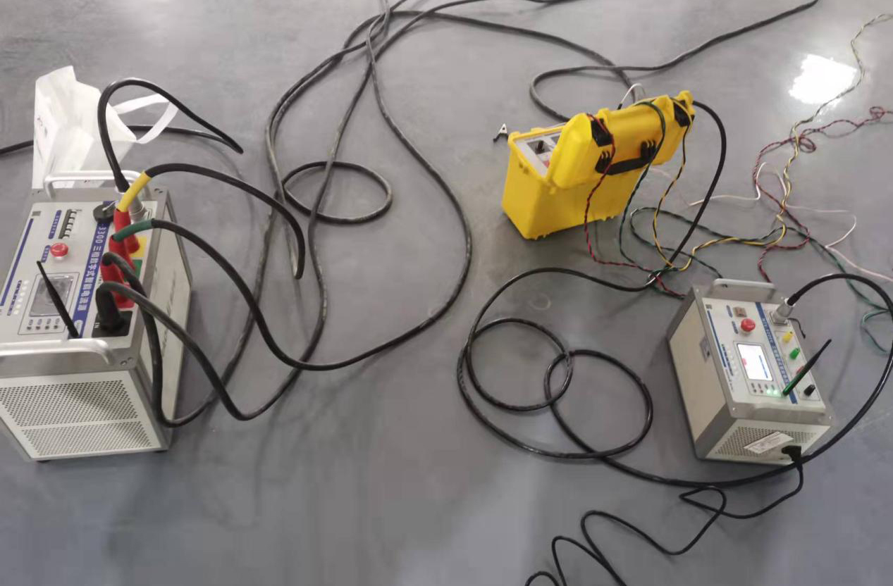 將電流源上的三相電流線接到CT一次側(cè)的進(jìn)線側(cè),黑色的接到出線側(cè)(反向后的輸出值顯示為反極性的值),將無線遙控的電流測試線夾到要測試的二次繞組之間(在保護(hù)裝置上也可讀取二次值),注意繞組電流的流向,測量線的指向應(yīng)與其相同,并且二次測試線應(yīng)插入遙控對應(yīng)相的入口,電壓源與升壓箱之間用航插電纜連接,然后將電壓線與PT的一次側(cè)連接,注意進(jìn)出線的方向,將PT二次側(cè)與遙控相連,插入對應(yīng)的電壓測量口內(nèi)即可進(jìn)行電壓二次測量,也可在保護(hù)裝置上讀取。