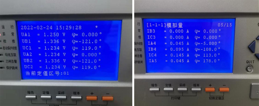 首先測試分相是否正確。加三相不平衡的電壓電流,查看二次采樣值A(chǔ)、B、C三相是否對應(yīng),再計算CT、PT的變比,通過與保護(hù)裝置上讀取的值進(jìn)行對比,判斷變比是否正常。