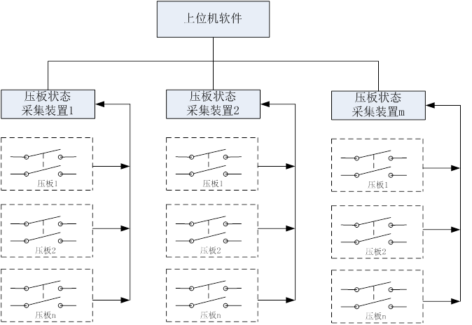 帶輔助接點(diǎn)的硬壓板外設(shè)輔助觸點(diǎn)可等效為一個(gè)接點(diǎn)。 壓板狀態(tài)監(jiān)測模塊一方面采集這些接點(diǎn)的狀態(tài),一方面集中上傳這些接點(diǎn)的狀態(tài)至上位機(jī)。 通過輔助接點(diǎn)的硬開出信號和上位機(jī)返回的報(bào)文確認(rèn)硬壓板的狀態(tài),實(shí)現(xiàn)“雙確認(rèn)”。