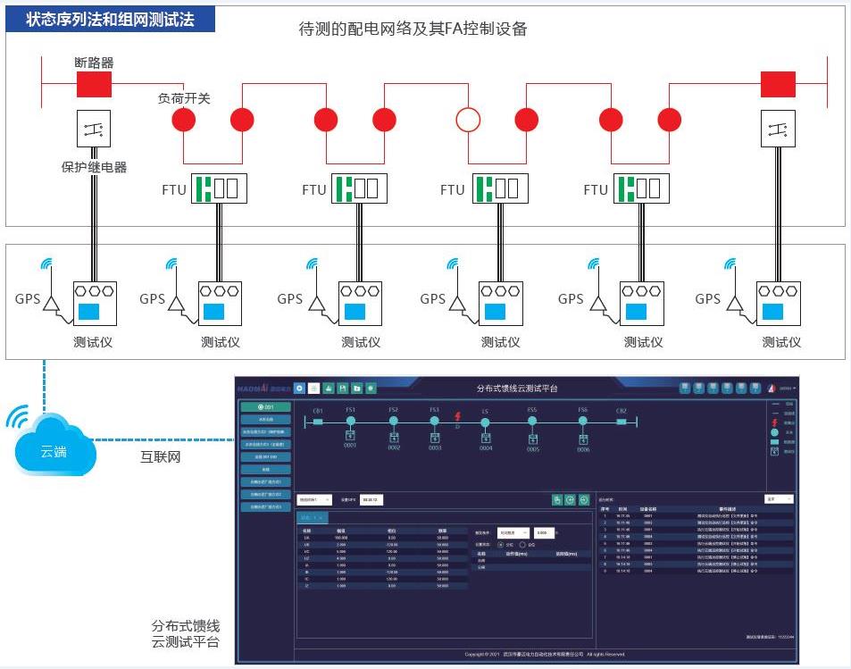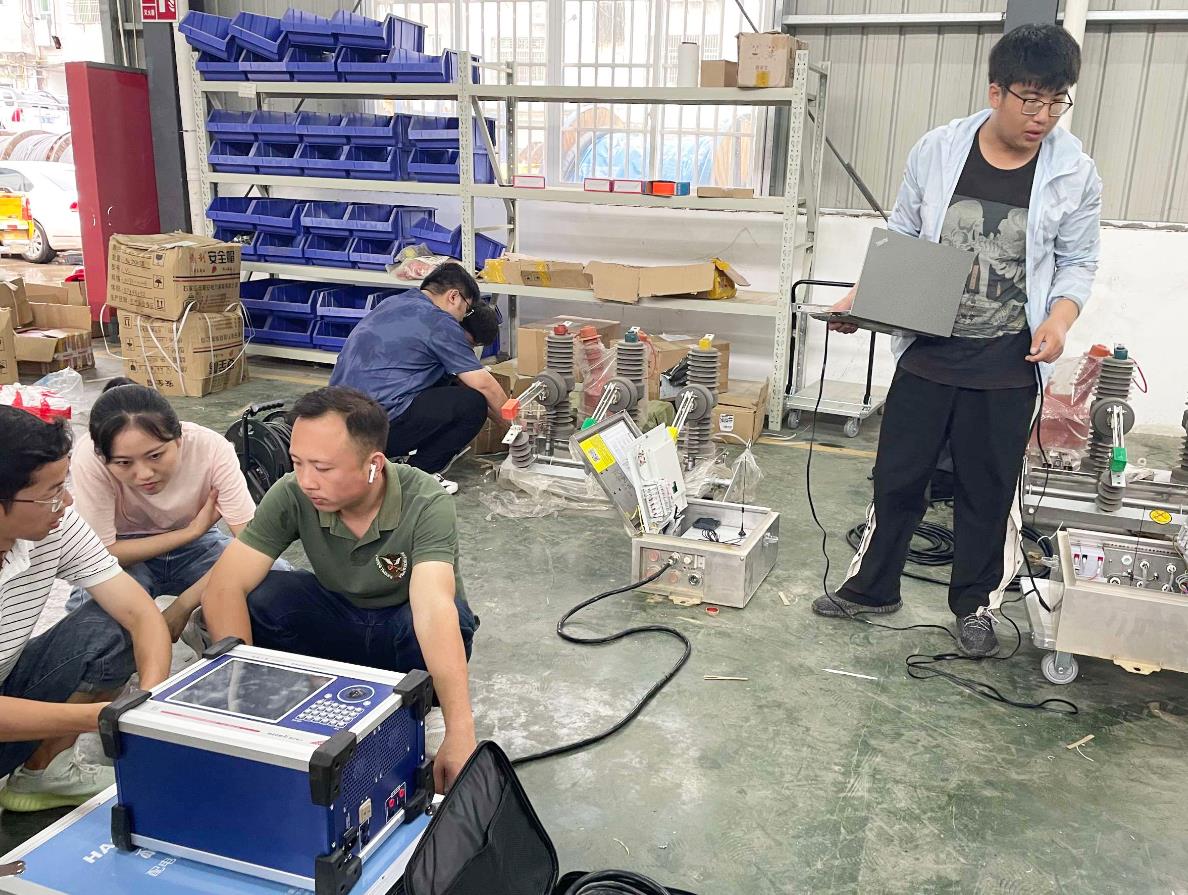 現(xiàn)場(chǎng)實(shí)操環(huán)節(jié),武漢豪邁電力提供配電之星-P2200 配電自動(dòng)化終端測(cè)試儀進(jìn)行終端設(shè)備測(cè)試。 基于線路實(shí)際狀況,主線敷設(shè)了3臺(tái)一二次融合真空開關(guān),利用開關(guān)“失壓分閘、來電延時(shí)合閘”功能,以電壓與時(shí)間為判據(jù),與變電站出線開關(guān)重合閘相配合,依靠設(shè)備終端自身邏輯判斷功能,配合主站點(diǎn)表及終端自動(dòng)推圖功能,確定故障點(diǎn),達(dá)到自動(dòng)隔離故障,恢復(fù)非故障區(qū)間供電的目的。 該線路設(shè)備倉(cāng)儲(chǔ)調(diào)試完畢,開關(guān)動(dòng)作正確,后期將安裝于工作線路中。