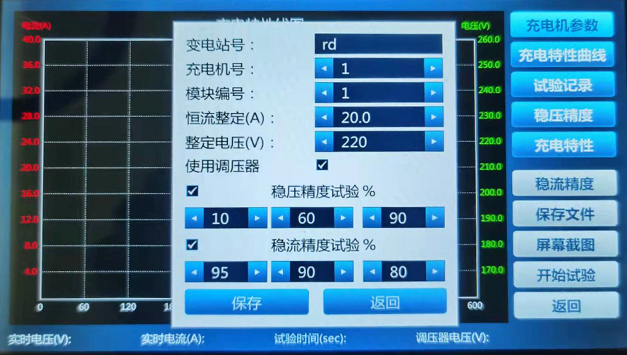 此次試驗(yàn)接入了調(diào)壓器,勾選使用調(diào)壓器,在穩(wěn)壓精度與穩(wěn)流精度試驗(yàn)中,裝置將自動(dòng)調(diào)節(jié)至額定交流輸入電壓的85%、100%、115%。