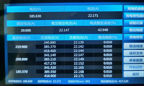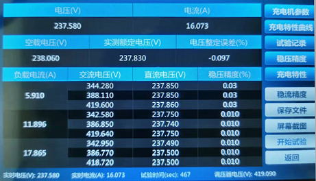 負(fù)載電流為之前設(shè)置的三個(gè)電流點(diǎn),交流電壓為調(diào)壓器的輸出值,直流電壓為對(duì)應(yīng)條件輸出的直流電壓,測(cè)試儀根據(jù)實(shí)測(cè)數(shù)據(jù)自動(dòng)計(jì)算出穩(wěn)壓精度。