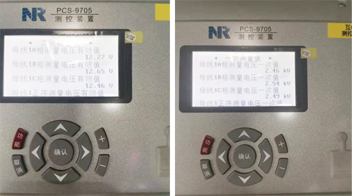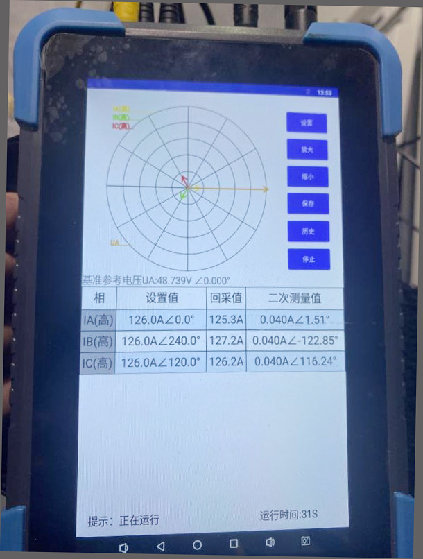 通過一次持續(xù)加量,在二次設(shè)備查看電流電壓的幅值和相位,從相位表上的矢量圖可以判斷極性是否正確。 由CT一次側(cè)加126A,二次側(cè)測得電流為0.04A,符合3150A/1A的變比。 電壓一次側(cè)加2500V,二次側(cè)電壓為12.46V,變比在基本誤差范圍之內(nèi),符合要求。