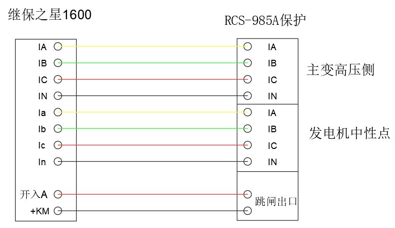 繼保之星-1600S 是一款6U6I型繼保儀,接線時按照IAIBIC接主變高壓側(cè)保護(hù)繞組,IaIbIc接發(fā)電機(jī)中性點(diǎn)側(cè)CT保護(hù)繞組,取一組跳閘出口接入測試儀開入量A,完成接線后即可開始試驗(yàn)。