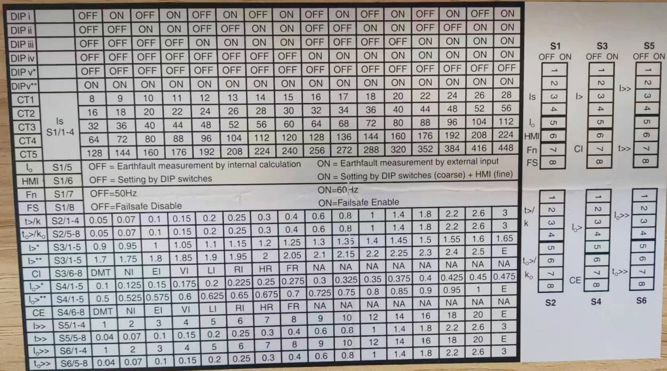 20kV佛康線8#環(huán)網(wǎng)柜04間隔對(duì)照上圖應(yīng)選擇電流互感器CT2,電流區(qū)間16A-56A,現(xiàn)場(chǎng)需更換AMZ-0.5W2(CT2)電流互感器,該間隔電流互感器變比為200/5,零序電流互感器為100/5,過流一段定值為7.1A/0S,過流二段定值1.8A/0.3S,CT電流大小選擇CT2區(qū)間56A,對(duì)應(yīng)上圖S1撥碼開關(guān)(S1開關(guān)序號(hào)1-4為CT開關(guān))為開、開、開、開;
