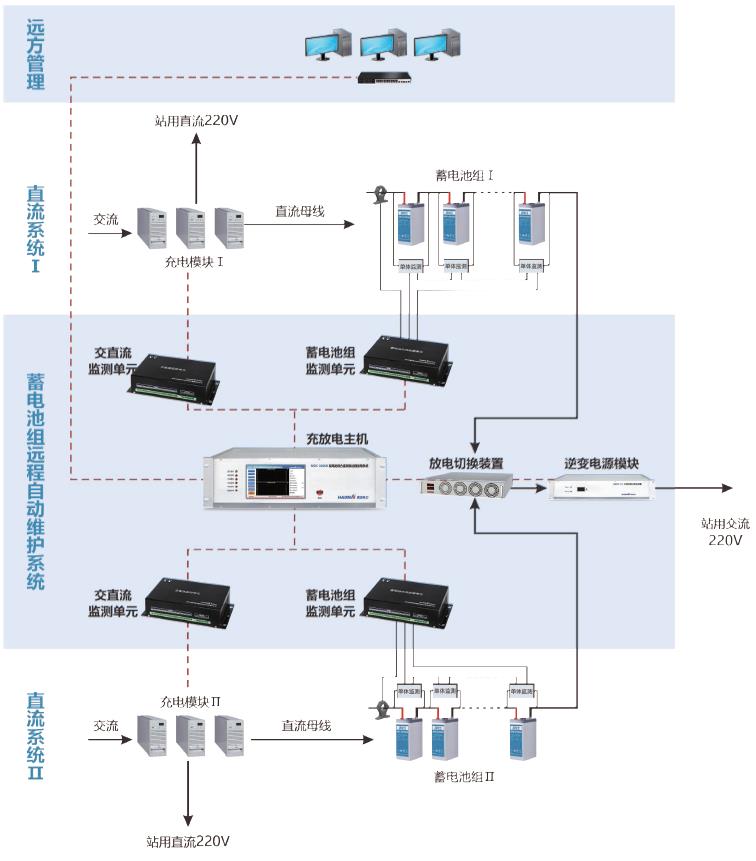 MDC-2000 變電站蓄電池綜合監(jiān)測及遠程自動維護系統(tǒng)由遠方管理后臺系統(tǒng)(管理層)、站端在線監(jiān)測和自動核容維護系統(tǒng)(執(zhí)行層)組成,包括逆變器、顯示器、主機、電動操作結構等部分。