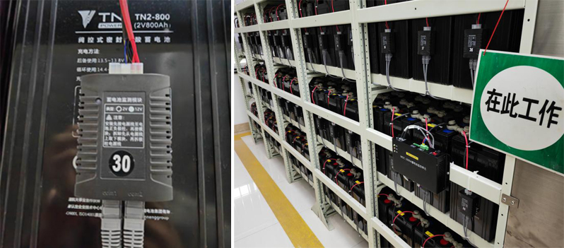 蓄電池室 : 現(xiàn)場220V直流系統(tǒng)配置104節(jié)2V800Ah蓄電池組,每節(jié)蓄電池連接在蓄電池極柱上的單節(jié)采集模塊,手拉手串聯(lián)采集單節(jié)數(shù)據(jù)上傳至主機分析。