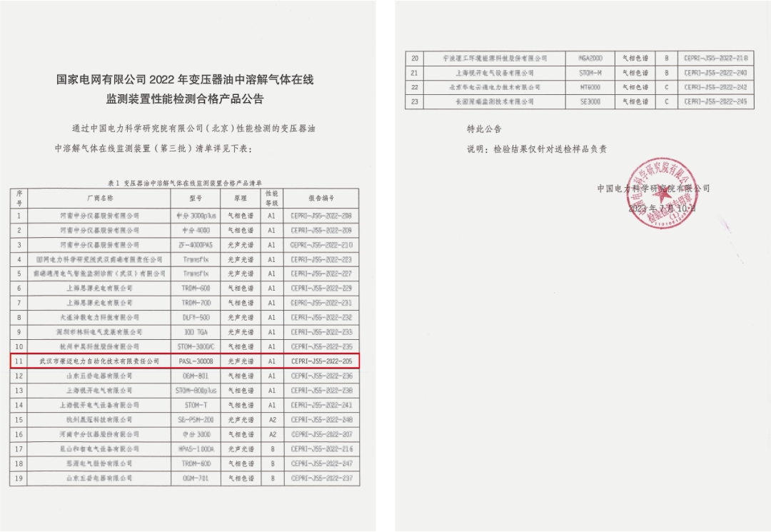 近期,中國(guó)電力科學(xué)研究院發(fā)布了國(guó)家電網(wǎng)有限公司2022年變壓器油中溶解氣體在線監(jiān)測(cè)裝置性能檢測(cè)合格產(chǎn)品公告, 武漢豪邁 自主研發(fā)的“ PASL-3000 激光光聲光譜變壓器油中氣體在線監(jiān)測(cè)系統(tǒng) ”順利通過全性能檢測(cè),達(dá)到性能等級(jí)A1級(jí),成為國(guó)內(nèi)僅有的3家采用激光光聲光譜原理裝置通過A1級(jí)檢測(cè)的公司之一。