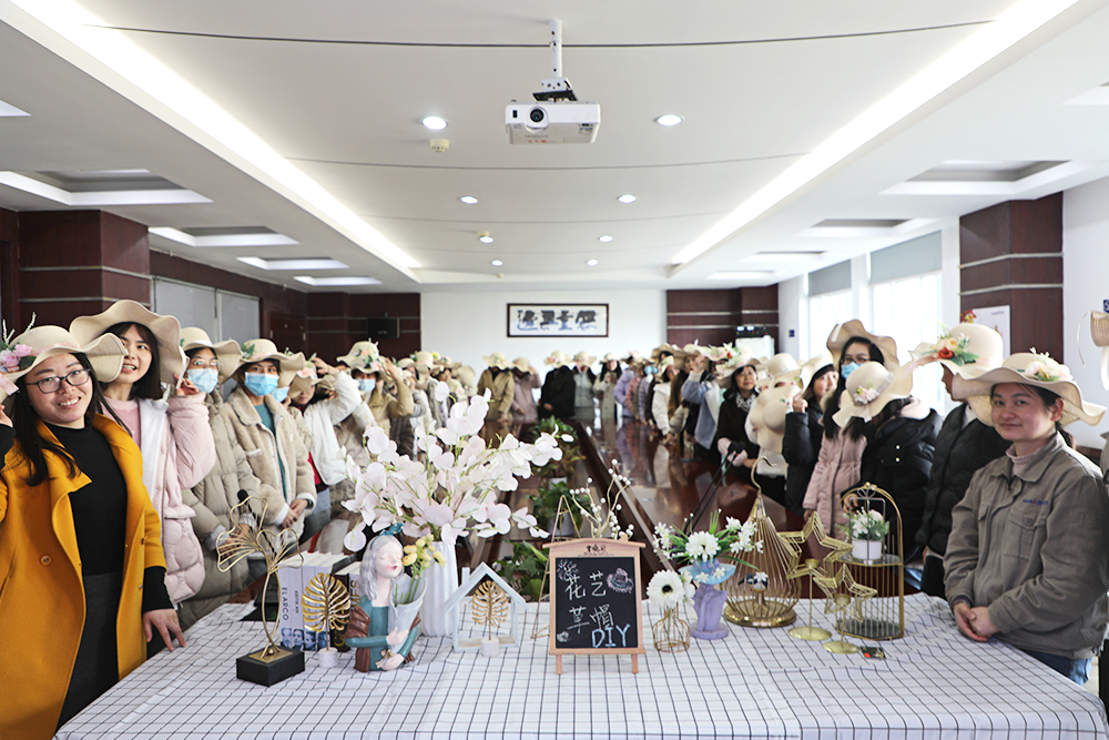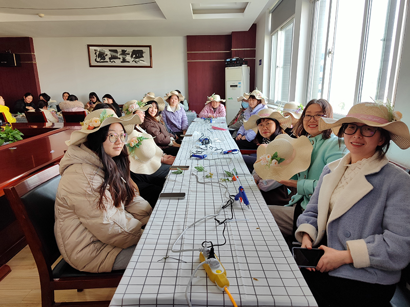 女員工們精心構思,盡情發(fā)揮想象力、創(chuàng)造力,認真挑選每一份絲帶和絹花,根據(jù)不同的色彩、形狀將其搭配在一起,固定在草帽上,色彩繽紛,錯落有致。活動現(xiàn)場氣氛熱烈,大家一邊制作,一邊交流心得,互相鼓勵,互相學習。經(jīng)過一番努力,草編與花藝結合,一頂頂普普通通的草帽變成了一件件具有藝術感和層次感的精美作品,有的款式簡單大方,有的華麗炫彩,個個獨具匠心,展現(xiàn)出了不同的個性和風采。