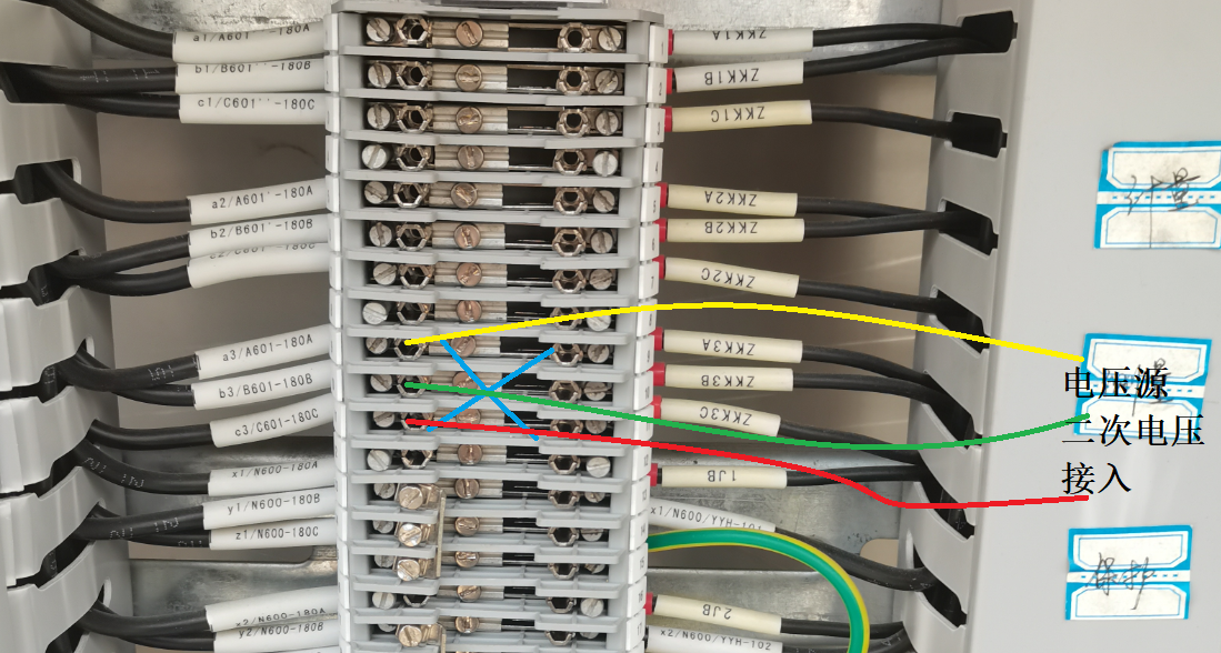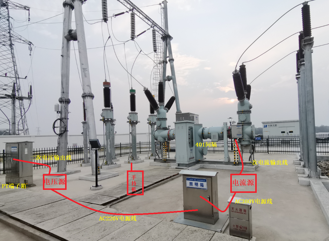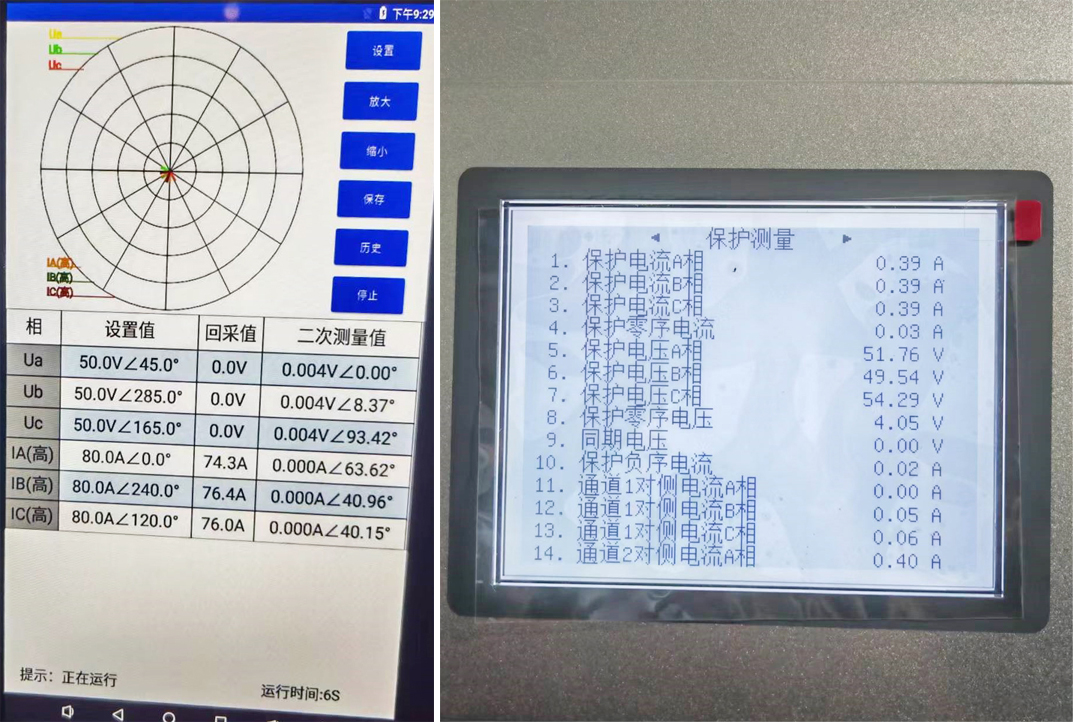 為了查看電流回路的絕對相角,需要施加二次電壓,通過HTV-6000 直接輸出額定電壓至保護裝置,以A相母線電壓為基準,可在各間隔保護裝置上查看CT二次幅值角度,根據(jù)CT極性端定義由此判斷向量極性是否正確。