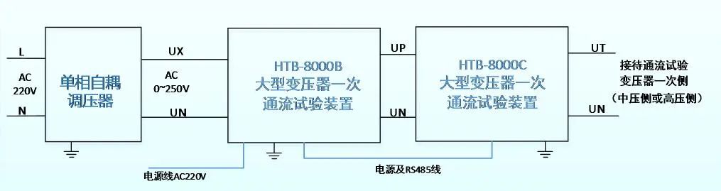 通流試驗接線: 將單相調壓器、HTB-8000B、HTB-8000C串接為A相輸出接線,B/C兩相同理,3臺單相自耦調壓器工作電源為AC380V(空開不小于16A),三相分別使用A/B/C的火線,零線共用(保證輸出120°相角差)。 HTB-8000B接入工作電源AC220V(10A),HTB-8000B與HTB-8000C通過電源與通訊共用航插線連接,各相之間無其他物理連接,系統(tǒng)輸出接入變壓器通流側。