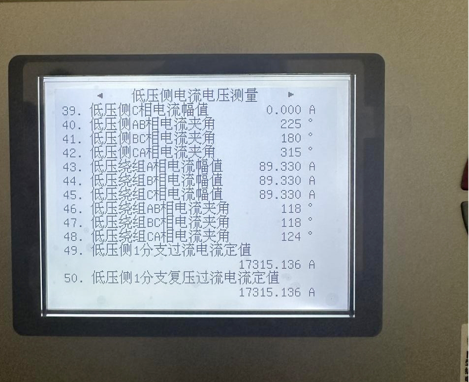中壓側額定電壓525/√3kV、低壓側額定電壓110kV,中壓側施加35A電流,計算出低壓繞組電流約為90A,與保護裝置顯示結果一致,查看后臺及其他采樣結果均正常,低壓繞組相間為120°正序,完成變電站低壓繞組的保護向量檢查。 以上同理完成變壓器高中壓繞組的保護向量檢查。