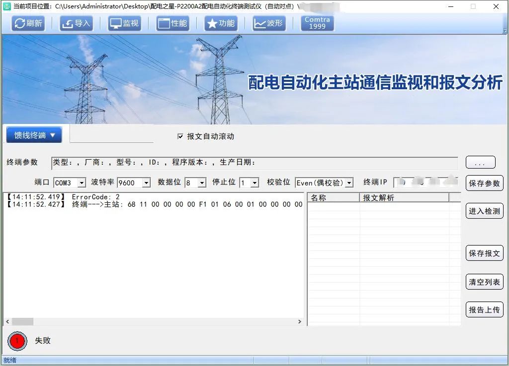 測試項目配置完成后,返回主界面點擊配網(wǎng)測試,導(dǎo)入配置的測試案例,填寫通訊模塊與測試儀相連接的串口、波特率、數(shù)據(jù)位、停止位、校驗位、終端SIM卡IP,填寫完畢后點擊保存與刷新。當(dāng)收到主站回復(fù)時,黃色與綠色提示燈交替閃爍,表示與主站通訊已建立,可進行自動對點測試。