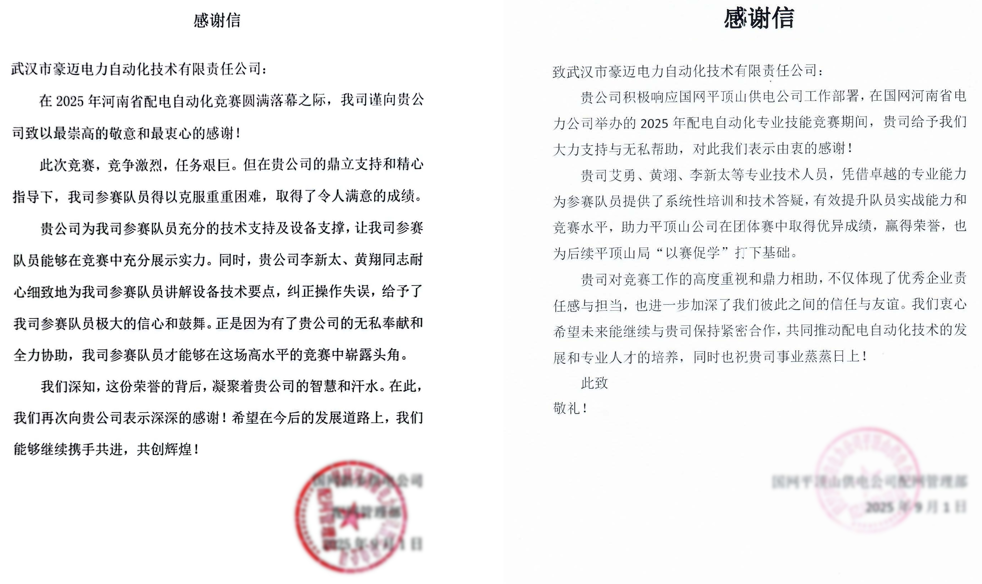賽后,國網(wǎng)河南省電力多家供電公司陸續(xù)發(fā)來感謝信,對武漢豪邁的技術(shù)服務(wù)表示高度認可。信中特別強調(diào),公司提供的設(shè)備支撐和技術(shù)指導,為參賽選手提供了優(yōu)質(zhì)的學習資源,通過耐心講解設(shè)備要點、分析糾正操作失誤,顯著提升了選手的實戰(zhàn)能力,為競賽取得優(yōu)異成績提供了有力保障。武漢豪邁對此深表感謝,并將繼續(xù)以優(yōu)質(zhì)的產(chǎn)品和服務(wù)回報用戶的信任與支持。