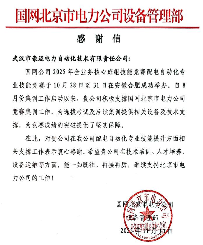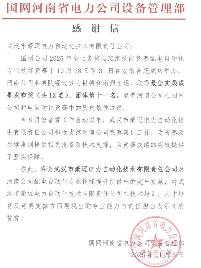 近日,武漢豪邁接連收到國網(wǎng)河南省電力、國網(wǎng)北京市電力發(fā)來的感謝信,信中高度肯定并感謝我司對國網(wǎng)公司2025年全業(yè)務核心班組技能競賽配電自動化專業(yè)技能競賽集訓工作的積極支撐??蛻粼谛胖斜硎?,武漢豪邁為選拔考試及集訓提供相關設備及技術支撐,為競賽成績的突破提供了堅實保障,并對公司在技術培訓、人才培育及競賽支撐方面展現(xiàn)出的專業(yè)能力與責任擔當表示高度贊賞。