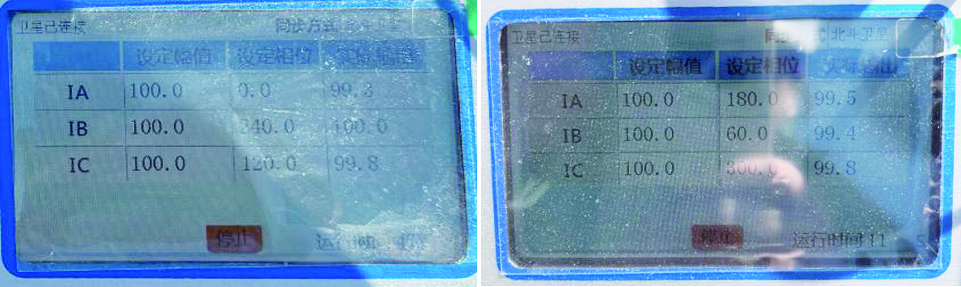 試驗(yàn)設(shè)備開機(jī)后,選擇 GPS 對(duì)時(shí)方式,兩站之間可通過 GPS 同步對(duì)時(shí)。對(duì)上時(shí)后按照變電站側(cè)電流源一次施加電流 A 相 100A ∠ 0 °, B 相 100A ∠ 240 °, C 相 100A ∠ 120 °,風(fēng)電場側(cè)電流源一次施加電流 A 相 100A ∠ 180 °, B 相 100A ∠ 60 °, C 相 100A ∠ 300 °分別輸出,通過 秒脈沖同步觸發(fā),保證過零時(shí)刻兩邊電流輸出相位同步。 在保護(hù)裝置 查看采樣和差流,完成線路差動(dòng)保護(hù)向量校核試驗(yàn)。