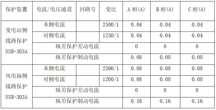 變電站側(cè)實(shí)際通流方向?yàn)槟妇€流向線路,風(fēng)電場側(cè)實(shí)際通流方向也為母線流向線路,保護(hù)裝置顯示電流均為折算后電流,差動(dòng)電流為 0 ,說明線路差動(dòng)保護(hù)向量正確。